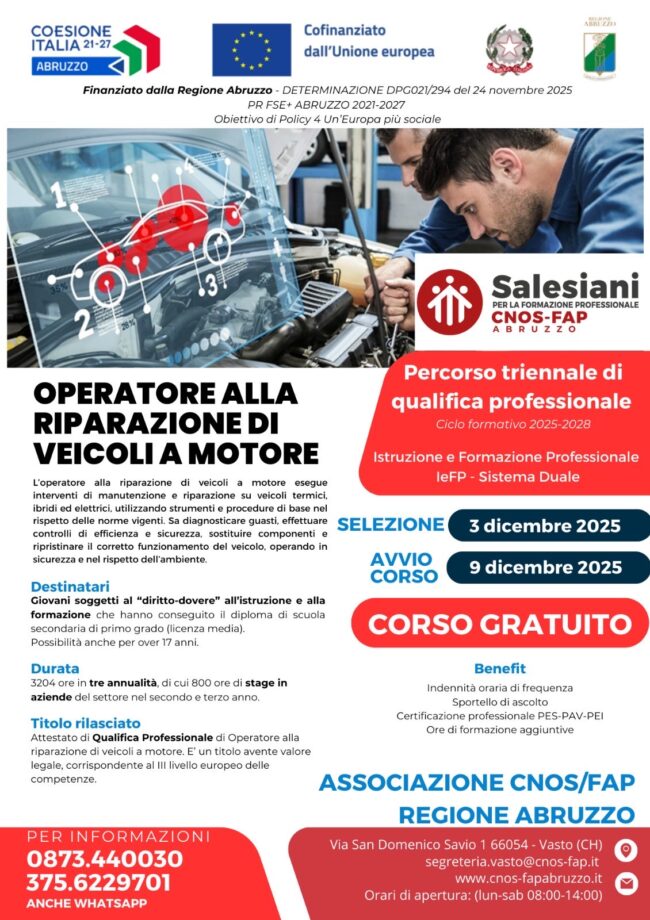 Il Centro di Formazione Professionale dei Salesiani Don Bosco di Vasto si conferma protagonista nella ripresa dell’istruzione professionale in Abruzzo: i progetti presentati per il ciclo IeFP 2025-2028 sono stati selezionati come secondo e terzo miglior progetto della Regione tra i 31 arrivati. Questa importante attribuzione — che conferma la fiducia delle istituzioni nel nostro…